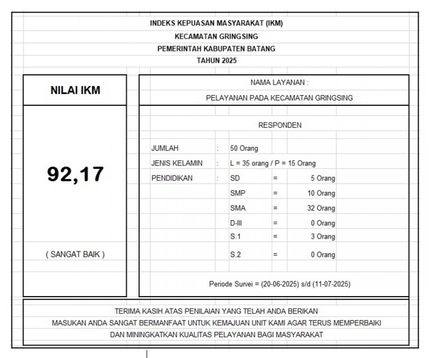 BATANG Pemerintah Kabupaten Batang melalui Kecamatan Gringsing merilis laporan Indeks Kepuasan Masyarakat (IKM) untuk tahun 2025. Berdasarkan hasil survei yang dilakukan pada periode 20 Juni hingga 11 Juli 2025, unit pelayanan di Kecamatan Gringsing berhasil memperoleh nilai indeks sebesar 92,17.